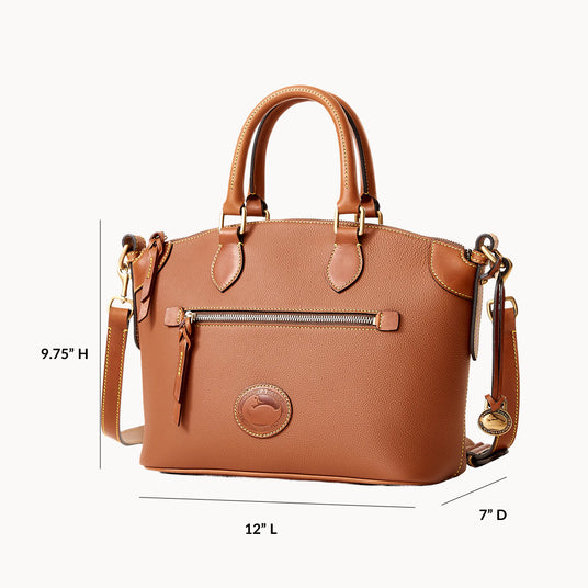 This handbag is gorgeous! I purchased this in green and it is beautiful! The quality is amazing and I'm loving the details - the braided leather zipper pulls, the leather Dooney duck label, the removable medallion and the inside leather trimmed pockets.