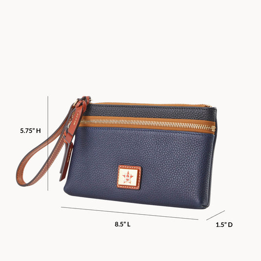 - Outside front zip pocket. One inside zip pocket. Six credit card slots.