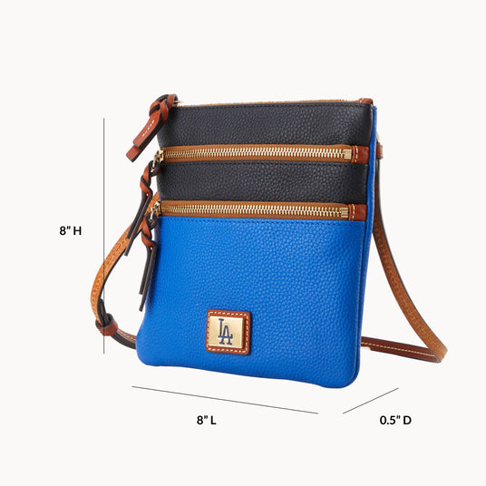 The MLB Dodgers Triple Zip Crossbody is compact yet thoughtfully laid out to keep your -day and weekend essentials close at hand. The three slim zip compartments are ideal for a small bifold wallet, smartphone, keys, and a compact cardholder, with room for game tickets, a lip balm or slim lipstick, and folded cash. The front two pockets conveniently separate items you need to grab quickly, like your ID or parking pass, while the main compartment keeps valuables secure and out of sight so you stay organized without feeling weighed down.