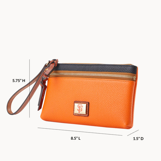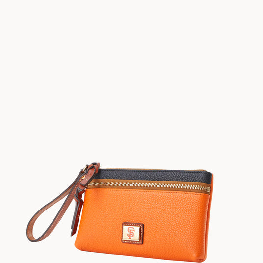 - Outside front zip pocket. One inside zip pocket. Six credit card slots.