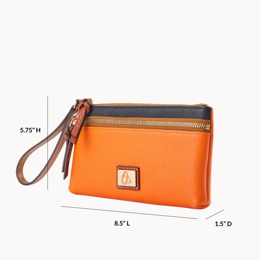 - Outside front zip pocket. One inside zip pocket. Six credit card slots.