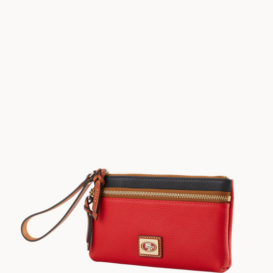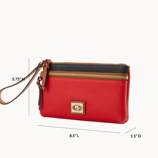- Outside front zip pocket. One inside zip pocket. Six credit card slots.