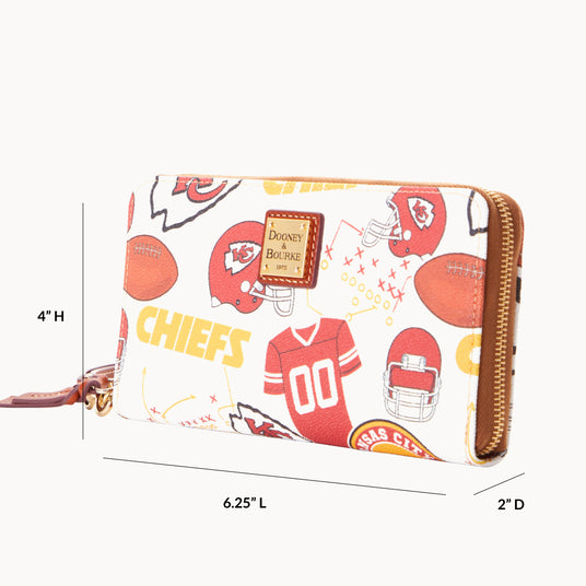 The NFL Chiefs Large Zip Around Wristlet offers sleek organization in a compact form. The interior provides space for cash, cards, coins, and receipts, along with a dedicated slot that fits most smartphones. Multiple card slots and a secure zip compartment keep essentials neatly arranged, while the zip-around closure ensures everything stays safely contained during busy days or game-day celebrations.