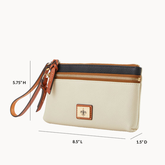 - Outside front zip pocket. One inside zip pocket. Six credit card slots.