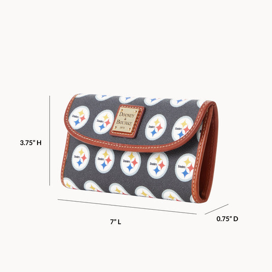 - One outside zip pocket. One inside pocket. License pocket with window. Two bill compartments. Eight credit card slots.