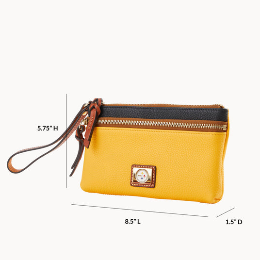 - Outside front zip pocket. One inside zip pocket. Six credit card slots.