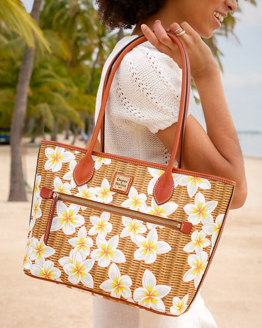 Sunny plumeria flowers pop against a classic wicker background in this coated Italian cotton collection.