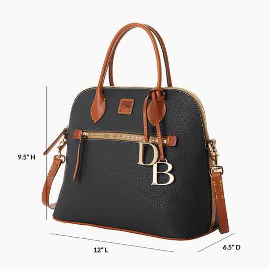 This classic domed satchel, made from pebble leather with a natural grain that hides any signs of wear, is stunning from any angle, thanks to its curved lines and eye-catching monogram charms.Details