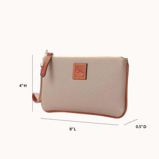 The Pebble Grain Medium Wristlet delivers compact functionality for on-the-go days. It easily fits your phone, card case, keys, lip balm, and cash, with space for small extras like receipts or earbuds. The zip-top closure keeps everything secure, while the slim profile slips easily into a larger tote or travel bag when needed. The detachable wrist strap makes it effortless to carry on its own for quick errands, coffee runs, or evenings out. Its structured silhouette pairs seamlessly with both casual and polished looks, offering a refined finishing touch that keeps your essentials close at hand.