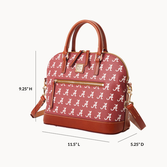 Root for your favorite collegiate team in style. Rolled top handles, curved lines, and an exterior zip pocket this is the iconic Domed Zip Satchel.Details