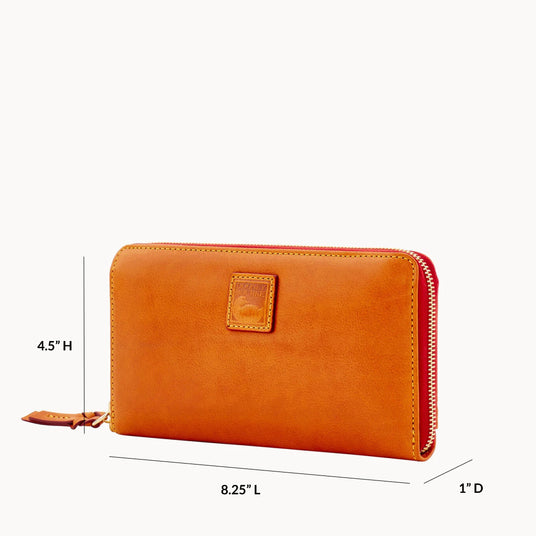 This functional wristlet, made from Italian Vacchetta leather that grows softer with age, offers multiple dividers, card slots, and an all-around zipper for security.Details