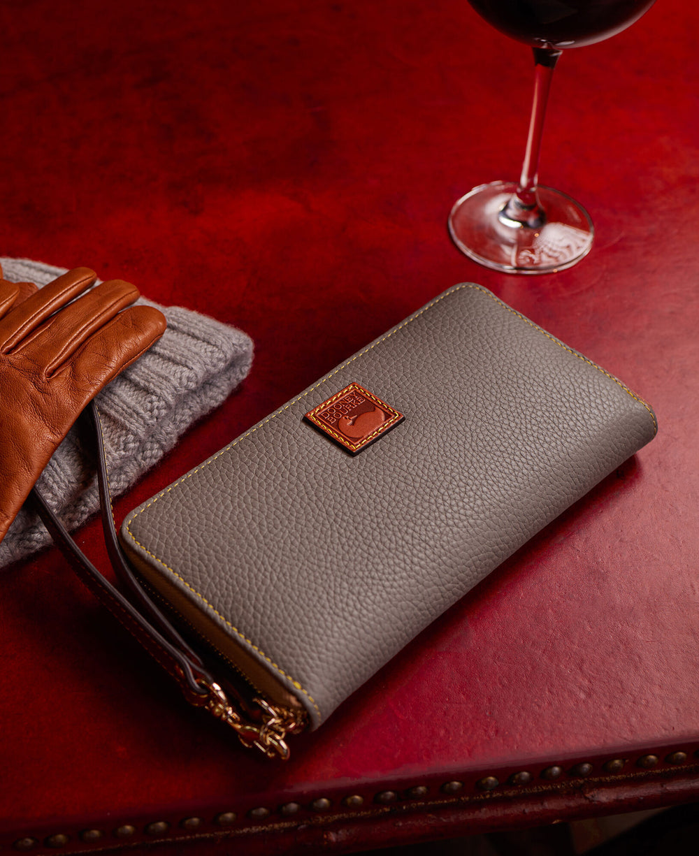 This secure wristlet, made from pebble leather with a natural grain that hides any signs of wear, organizes everything you'll need for a day or night out.Details