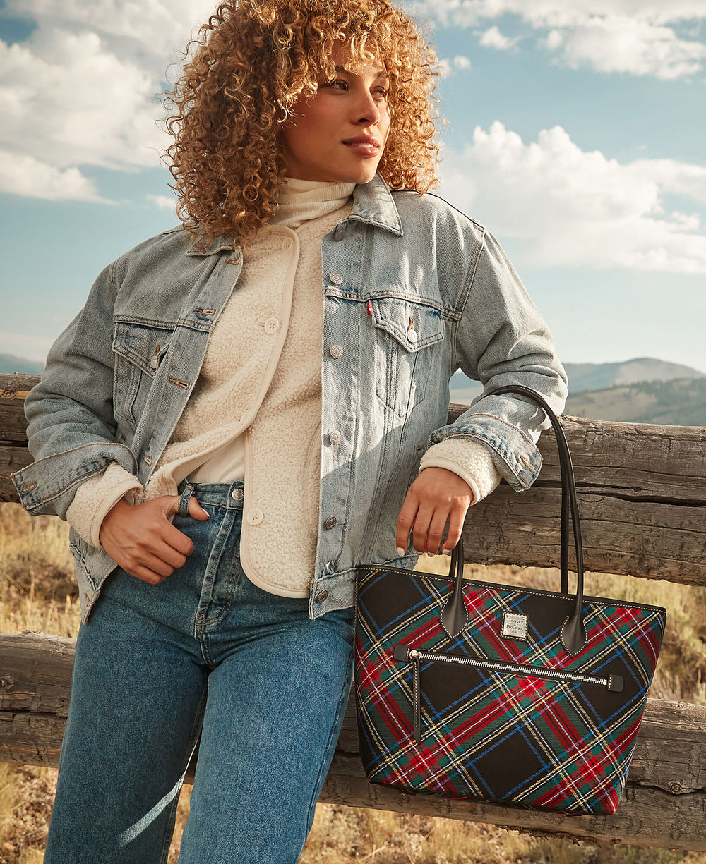 This cozy woven cotton fabric has a plaid pattern that's both modern and a little bit nostalgic. A quintessential tote, with a roomy interior and lengthy leather straps, is the perfect everyday bag.Details